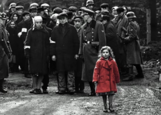 In black and white, the figure of a little girl in a red coat becomes the most glaring footnote to human conscience.